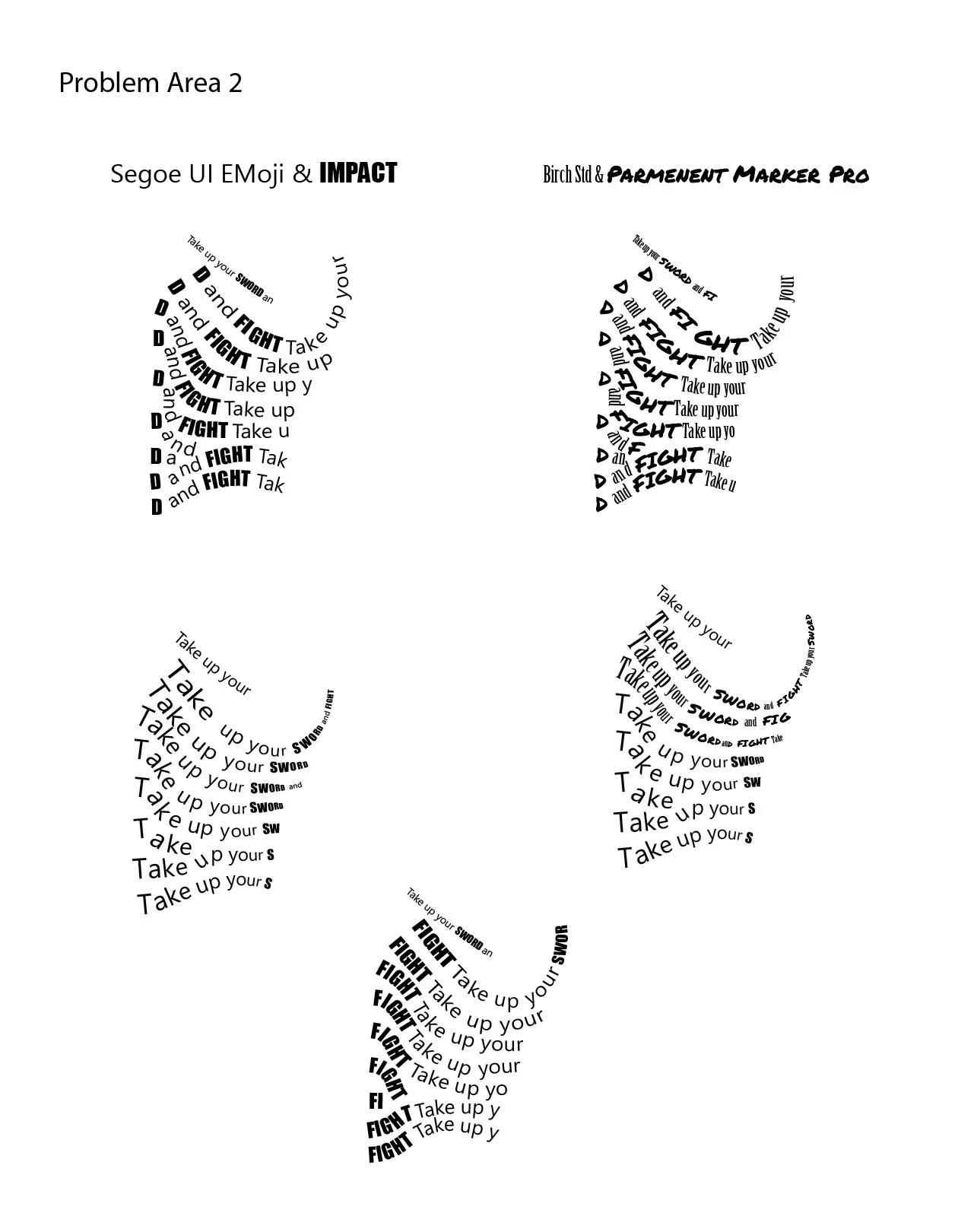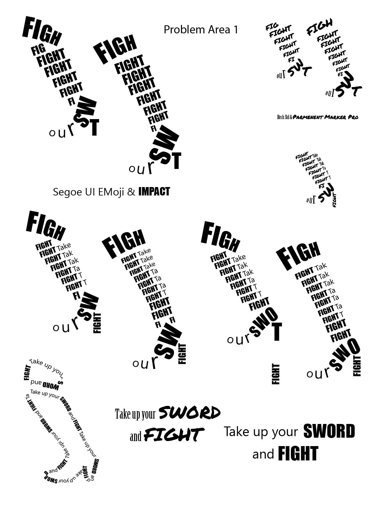 When I figured out on paper how I wanted to set up my type figure, I then moved on to working on the computer. I took two areas I know would give me more trouble then others and began experimenting again. I tried different type fonts, different type sizes, and more, putting them together to see what best expressed the form I was wanting. It took some work, but I got to a place I was very happy with.